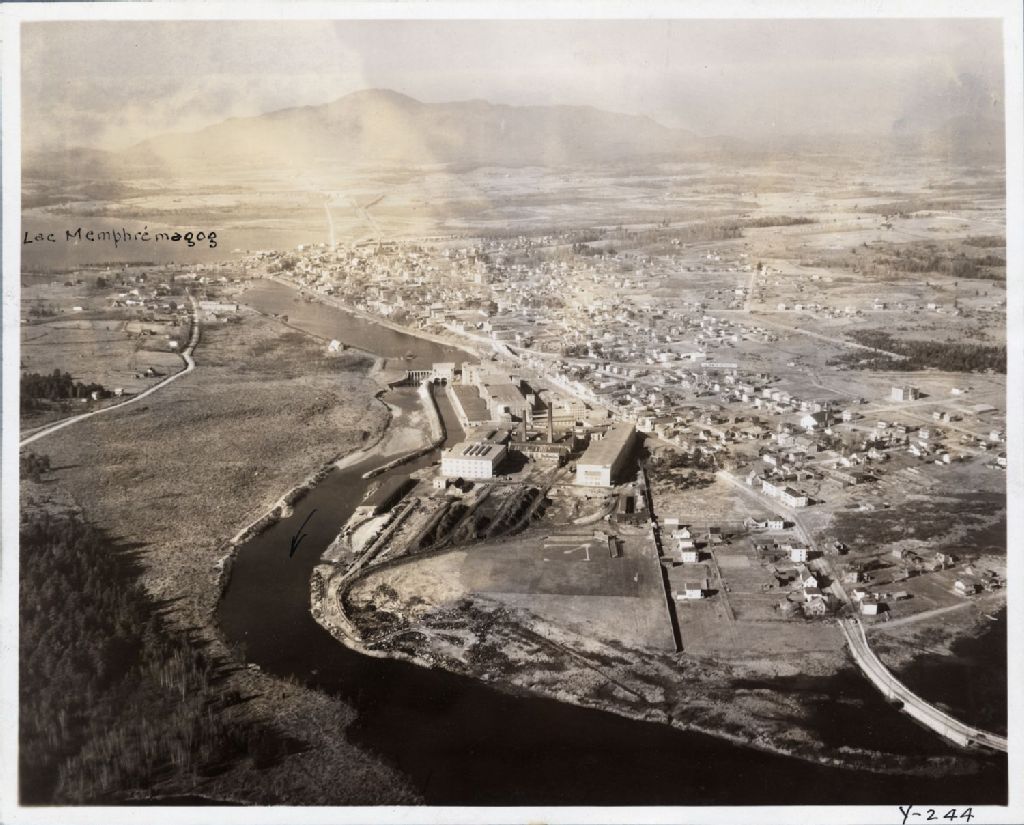 Rivière Magog, Barrage Dominon textile Co. - Vue aérienne du barrage et usines de la Dominion Tetile et du village de Magog