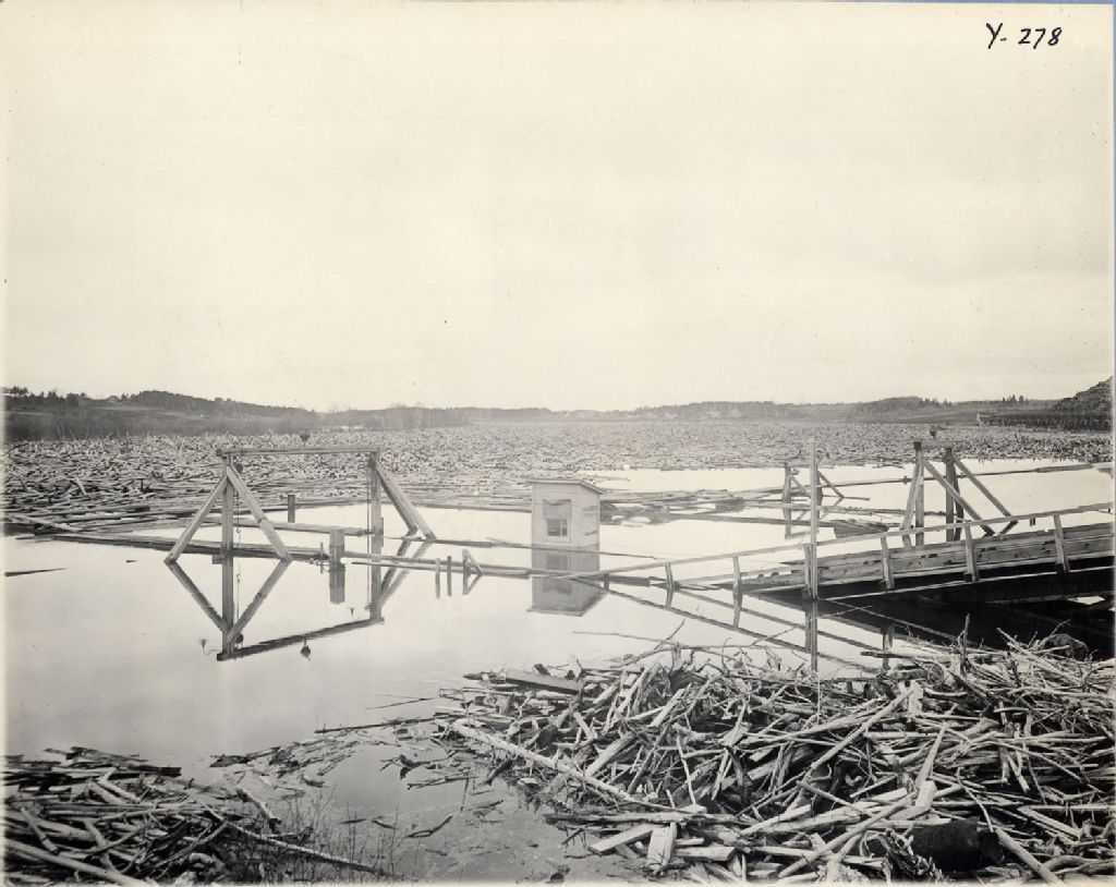 Rivière Saguenay - Inondation 1928 - View of logs held by booms in Petite Décharge at Riverbend Paper Mills during flood, Mai 1928, Archives nationales à Québec, Fonds Ministère de l'Environnement et de la Lutte contre les changements climatiques, (03Q,E57,S44,SS1,D100,PY-278), Photographe non identifié.