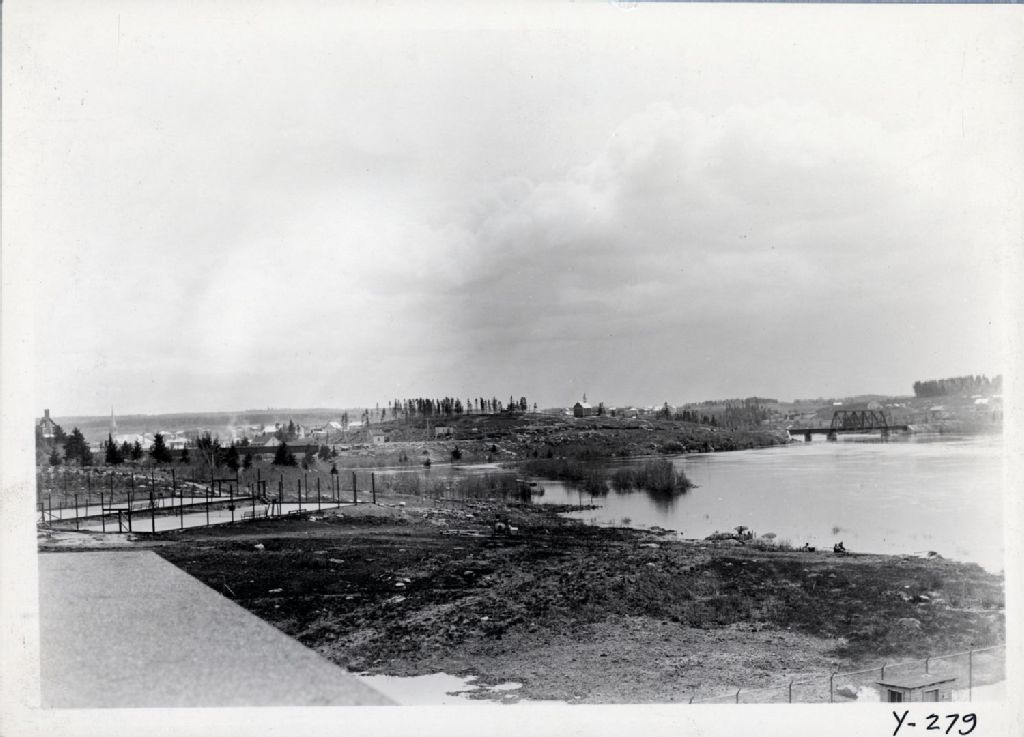 Rivière Saguenay - Inondation 1928 - Petite Décharge from Price Bros. Mills, looking downstream W. L. at pumphouse 27.05