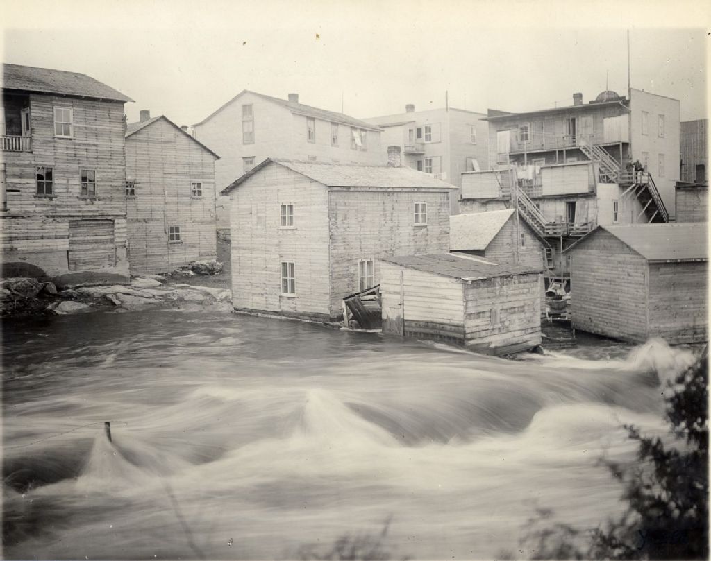 Rivière Saguenay - Inondation 1928 - Petite Décharge high water channel, upstream of higway bridge, Mai 1928, Archives nationales à Québec, Fonds Ministère de l'Environnement et de la Lutte contre les changements climatiques, (03Q,E57,S44,SS1,D100,PY-286), Photographe non identifié.