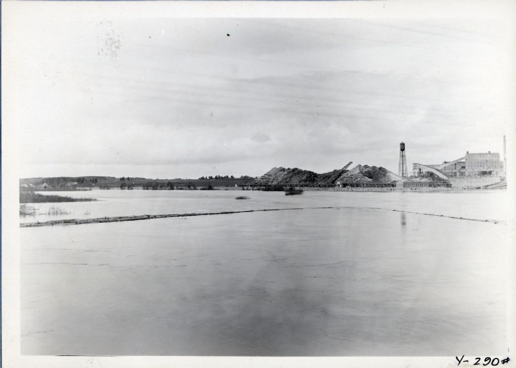 Rivière Saguenay - Inondation 1928 - Upstream view of main channel of Petite Décharge from railroad bridge, on the right Riverbend Pulp & Paper Mill. W. L. at punphouse 27.4