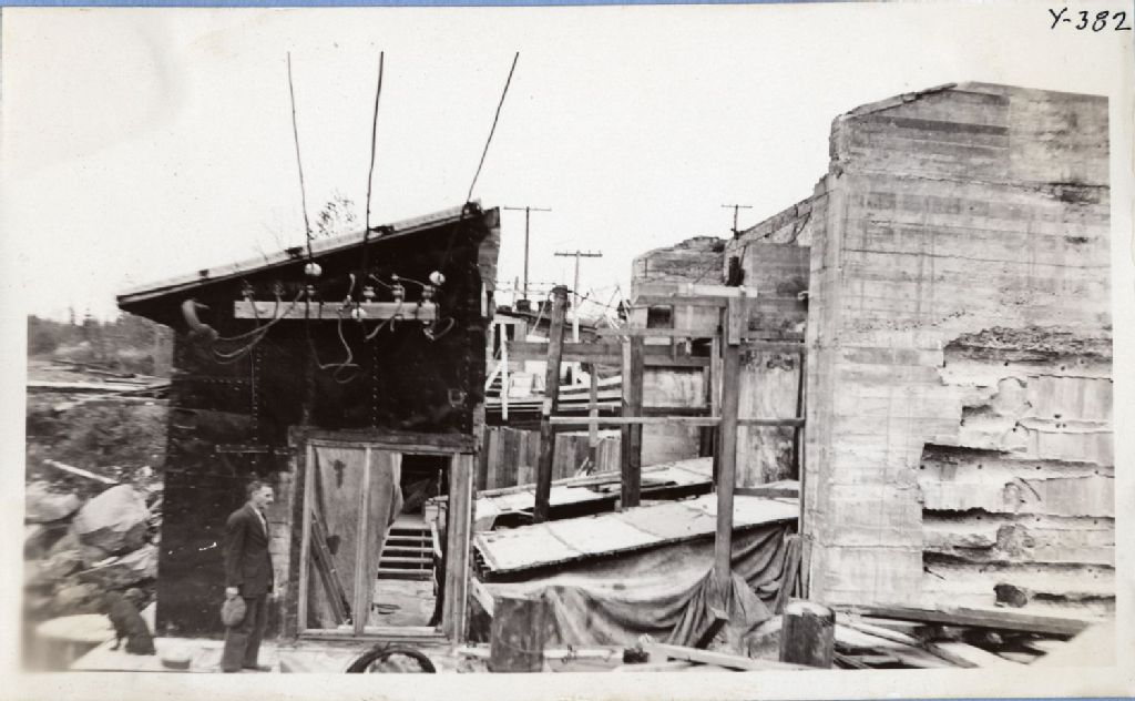 Rivière Saint-Maurice - Usine La Loutre - construction - Protection de la machinerie et appareils électriques - Vue de la rive est, 8 octobre 1931, Archives nationales à Québec, Fonds Ministère de l'Environnement et de la Lutte contre les changements climatiques, (03Q,E57,S44,SS1,D76,PY-382), Photographe non identifié.