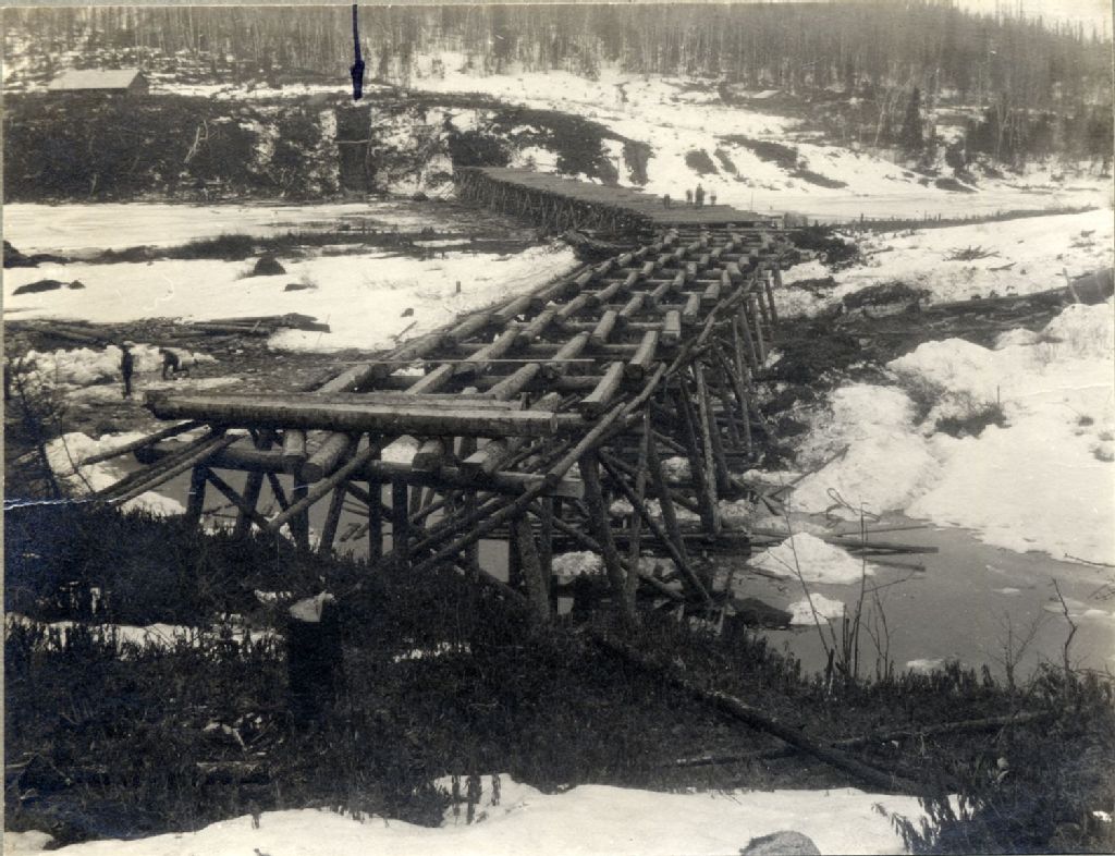 Rivière Saint-Maurice - Barrage Gouin - Construction - View of trestle looking west from east bank, 17 avril 1916, Archives nationales à Québec, Fonds Ministère de l'Environnement et de la Lutte contre les changements climatiques, (03Q,E57,S44,SS1,D76,PY-422), Photographe non identifié.