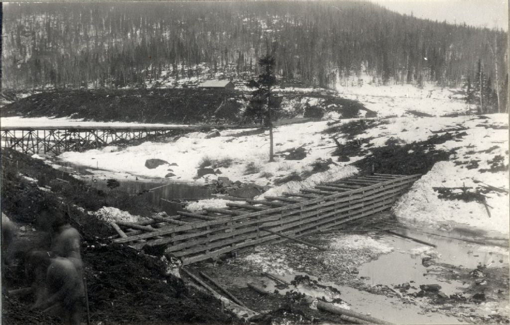 Rivière Saint-Maurice - Barrage Gouin - Construction - View of north coffer east channel Trestle in distance also store-house, 17 avril 1916, Archives nationales à Québec, Fonds Ministère de l'Environnement et de la Lutte contre les changements climatiques, (03Q,E57,S44,SS1,D76,PY-436), Photographe non identifié.