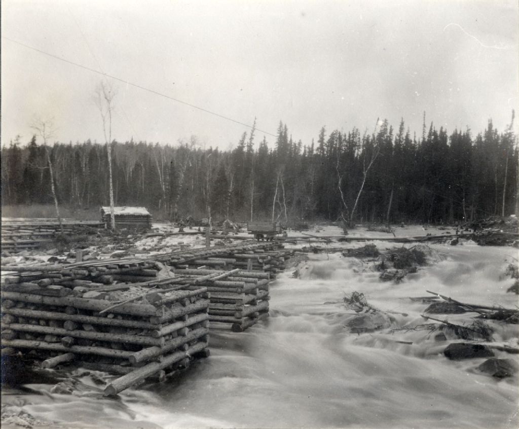 Rivière Saint-Maurice - Usine La Loutre - Construction - Showing the water flooing round the east end of the diversion crib P.H. [Power-House], 15 mai 1916, Archives nationales à Québec, Fonds Ministère de l'Environnement et de la Lutte contre les changements climatiques, (03Q,E57,S44,SS1,D76,PY-445), Photographe non identifié.
