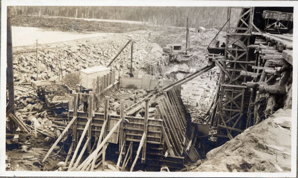 Rivière Saint-Maurice - Barrage Gouin - Construction - [Vue d'une partie des fondations et des travailleurs], 6 juin 1917, Archives nationales à Québec, Fonds Ministère de l'Environnement et de la Lutte contre les changements climatiques, (03Q,E57,S44,SS1,D76,PY-539), Photographe non identifié.