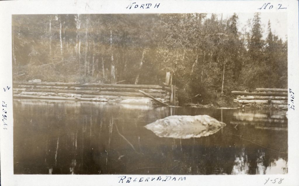 Ottawa supérieure, Rivière Kanasuta - Barrage Booth, " J. R. Booth Lumber's Co's wooden dam at the outlet of Dasserat Lake, upstream view ", janvier 1929, Archives nationales à Québec, Fonds Ministère de l'Environnement et de la Lutte contre les changements climatiques, (03Q,E57,S44,SS1,D283,PY-58), Photographe non identifié.