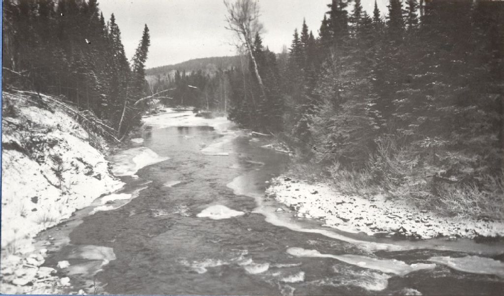 Rivière Mitis - Vue de la rivière, [avant 1927], Archives nationales à Québec, Fonds Ministère de l'Environnement et de la Lutte contre les changements climatiques, (03Q,E57,S44,SS1,D152,PY-723-5), F. B. Brown.