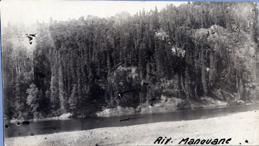 Rivière Péribonka - Embouchure de la rivière Manouane, août 1917, Archives nationales à Québec, Fonds Ministère de l'Environnement et de la Lutte contre les changements climatiques, (03Q,E57,S44,SS1,D328,PY-729-2), Photographe non identifié.