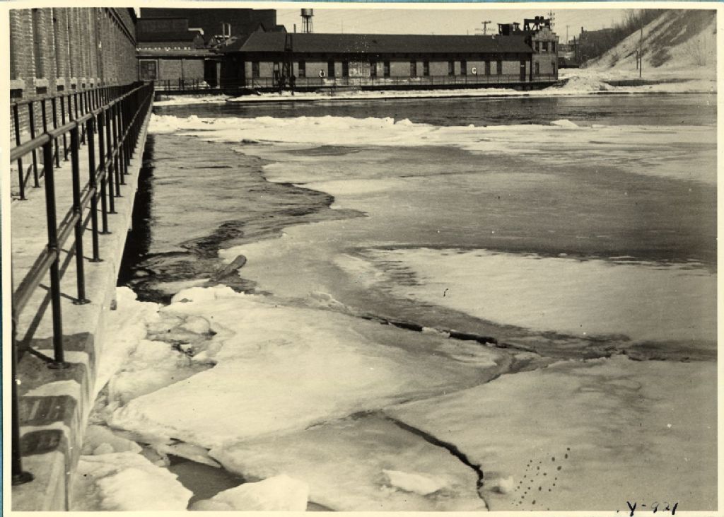 Rivière Saint-Maurice - Glace - Shawinigan Falls - Ice progress at gatehouse, 14 avril 1934, Archives nationales à Québec, Fonds Ministère de l'Environnement et de la Lutte contre les changements climatiques, (03Q,E57,S44,SS1,D76,PY-921), Photographe non identifié.