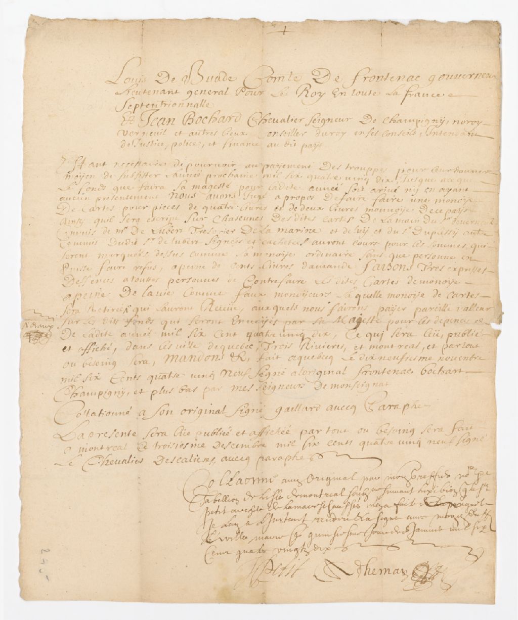 Ordonnance de Louis de Buade, Comte de Frontenac, et de Jean Bochart Champigny, gouverneur et intendant de la Nouvelle-France, interdisant la contrefaçon de la monnaie de cartes