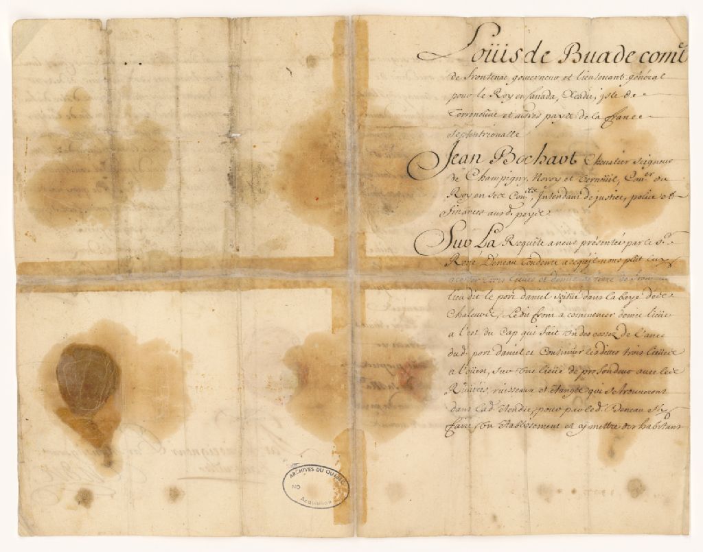 Acte de concession par Louis de Buade, Comte de Frontenac, et Jean Bochart Champigny, gouverneur et intendant de la Nouvelle-France, à René Deneau de trois lieues et demie de terre de front au lieu dit le Port-Daniel dans la baie des Chaleurs, ledit front commençant à une demi-lieue à l'est du cap qui fait un des côtés de l'anse dudit Port-Daniel et continuant à l'ouest sur une lieue de profondeur, avec les rivières, ruisseaux et étangs se trouvant dans ladite étendue, à titre de fief et seigneurie avec haute, moyenne et basse justice