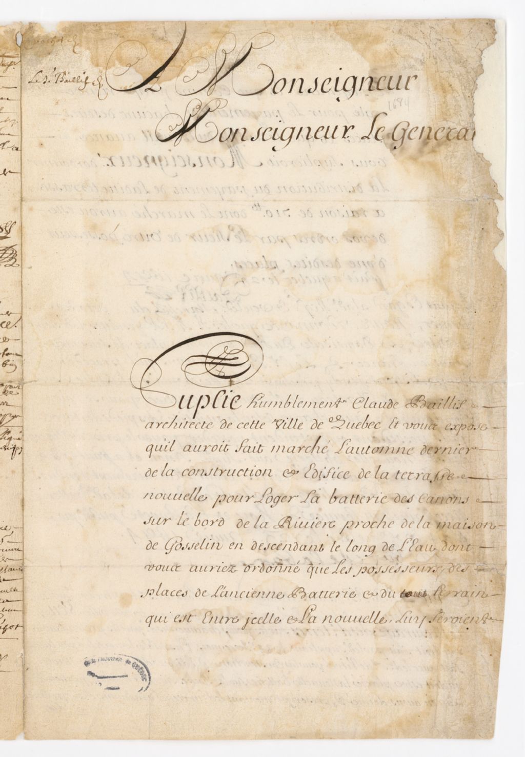 Requête de Claude Baillif, architecte de Québec, à Joseph-Antoine Lefebvre de La Barre, gouverneur de la Nouvelle-France, afin de recevoir le paiement de la construction et édifice de la terrasse nouvelle pour loger la batterie des canons sur le bord de la rivière (fleuve Saint-Laurent) qu'il a construite proche de la maison de Gosselin dans Québec (le paiement doit se faire à même la vente des places de l'ancienne batterie) ; assignation aux Jésuites, aux sieurs de Vitré et Pachot ainsi qu'à la damoiselle Dupont à comparaître au château Saint-Louis; condamnation de ces individus à payer les sommes demandées; quittances de Claude Baillif à François Pachot et à Jeanne Gaudais Dupont, 24 avril 1684, Archives nationales à Québec, Fonds Gouverneurs, régime français, (03Q,R1,P33).