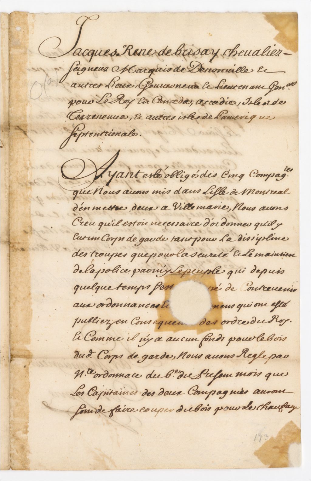 Ordonnance de Jacques-René de Brisay, marquis de Denonville, gouverneur de la Nouvelle-France, établissant un corps de garde à Montréal