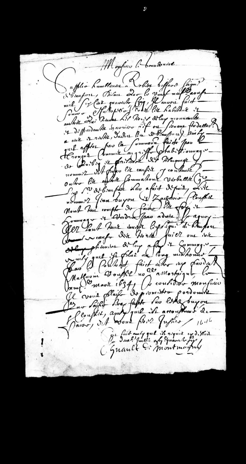 Requête par Robert Giffard, seigneur de Beauport, à Charles Huault de Montmagny, gouverneur de la Nouvelle-France, lui demandant permission de procéder à la saisie des terres de Jean Guyon (Guion) et Zacharie Cloutier pour manque de foi et hommage, et permission accordée par ledit gouverneur