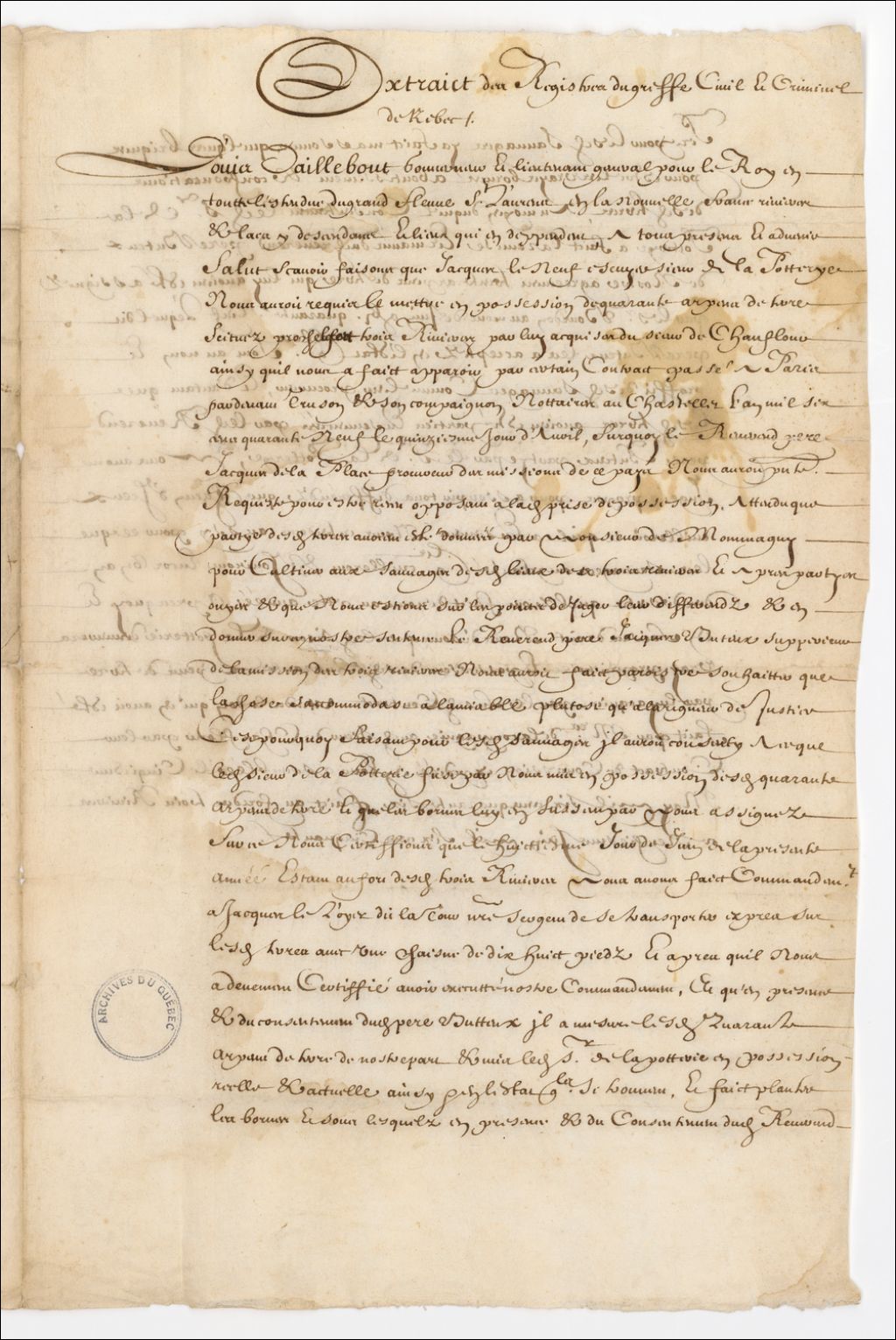 Acte de mise en possession par Louis d'Ailleboust, gouverneur de la Nouvelle-France, au profit de Jacques LeNeuf, écuyer, sieur de la Potterye (Potherie, LaPotherie), de quarante arpents de terre près des Trois-Rivières, lesquels arpents ayant été acquis par lui du sieur de Chanflour par contrat du 15 avril 1649 devant Cruson à Paris, lequel acte de mise en possession ayant été fait à la suite de l'opposition du Révérend Père Jacques de La Place (LaPlace), gouverneur des Missions en la Nouvelle-France, parce que lesdites terres avaient été préalablement concédées au profit des Sauvages (Amérindiens) par Charles Huault de Montmagny, ancien gouverneur de la Nouvelle-France, et d'un compromis à l'amiable entre le Révérend Père Jacques Buteux, supérieur desdites Missions, et ledit sieur de LaPotherie