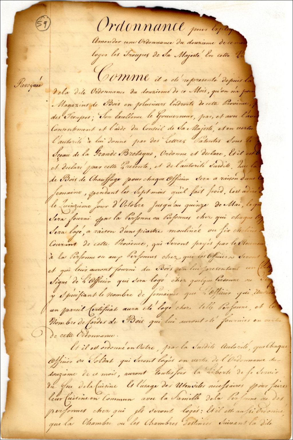 Ordonnance par le gouverneur James Murray et le Conseil du [Roi] pour expliquer et amender une ordonnance du douzième jour de ce mois (novembre), pour le logement des troupes de Sa Majesté en cette province, 29 novembre 1764, Archives nationales à Québec, Fonds Gouverneurs, régime anglais, (03Q,R2,S1,D1,P18).