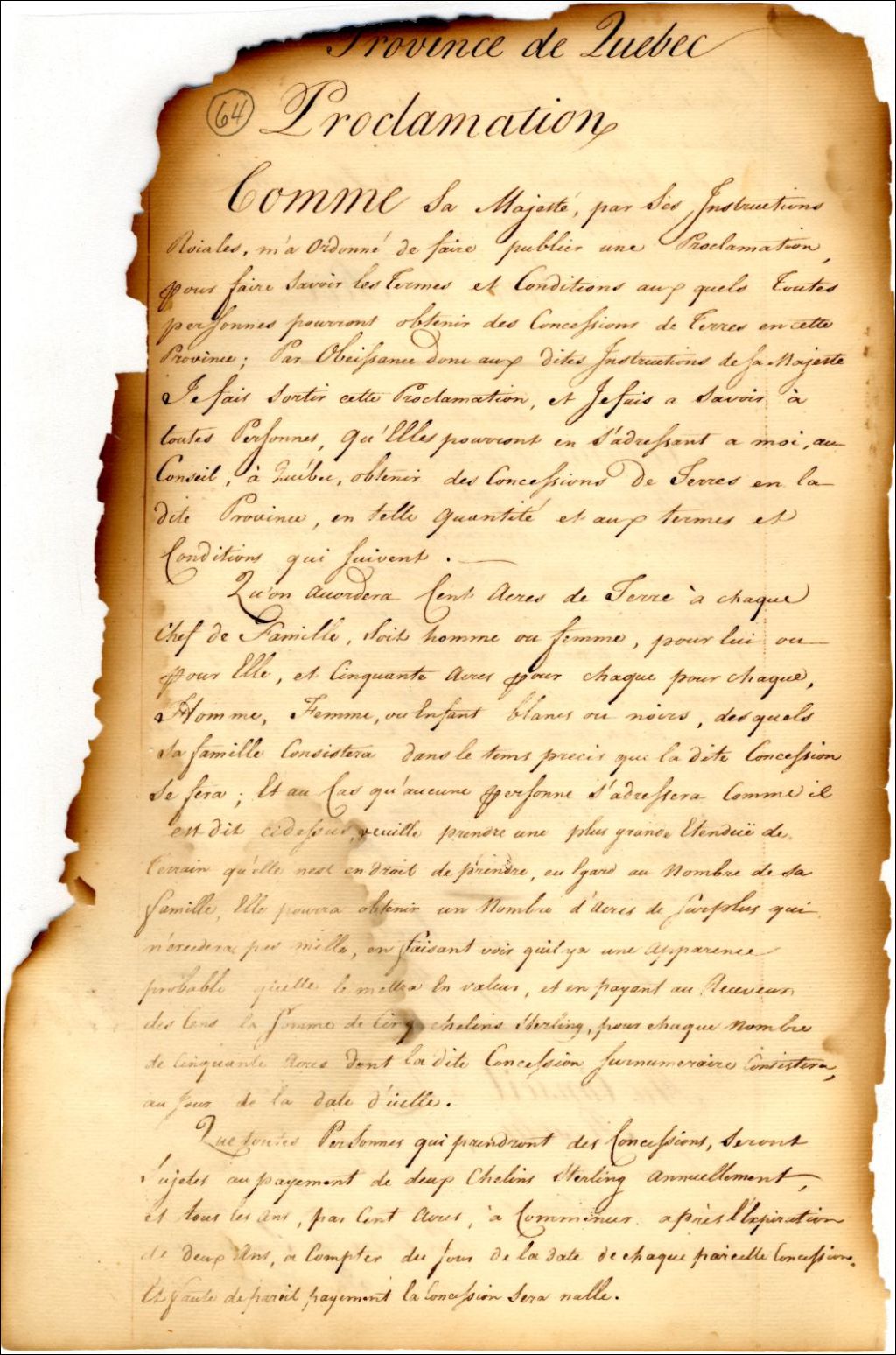 - Proclamation du gouverneur James Murray et le Conseil du [Roi] sur les termes et conditions pour obtenir des concessions de terre dans la province de Québec