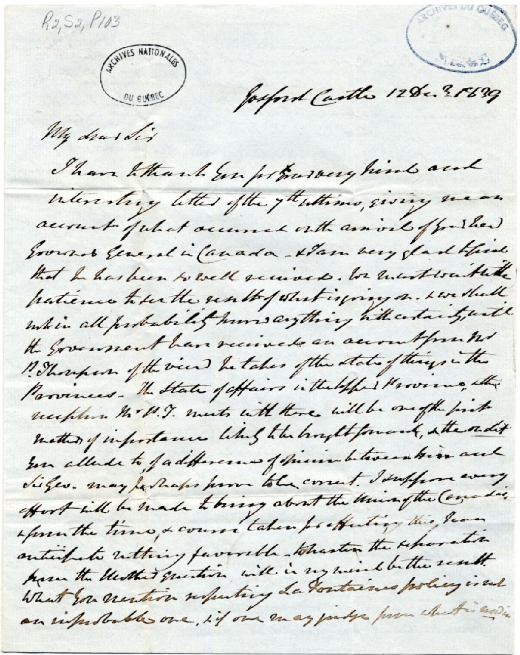 - Lettre personnelle du gouverneur Archibald Acheson, comte de Gosford, à John Davidson, commissaire des Terres de la couronne à Québec