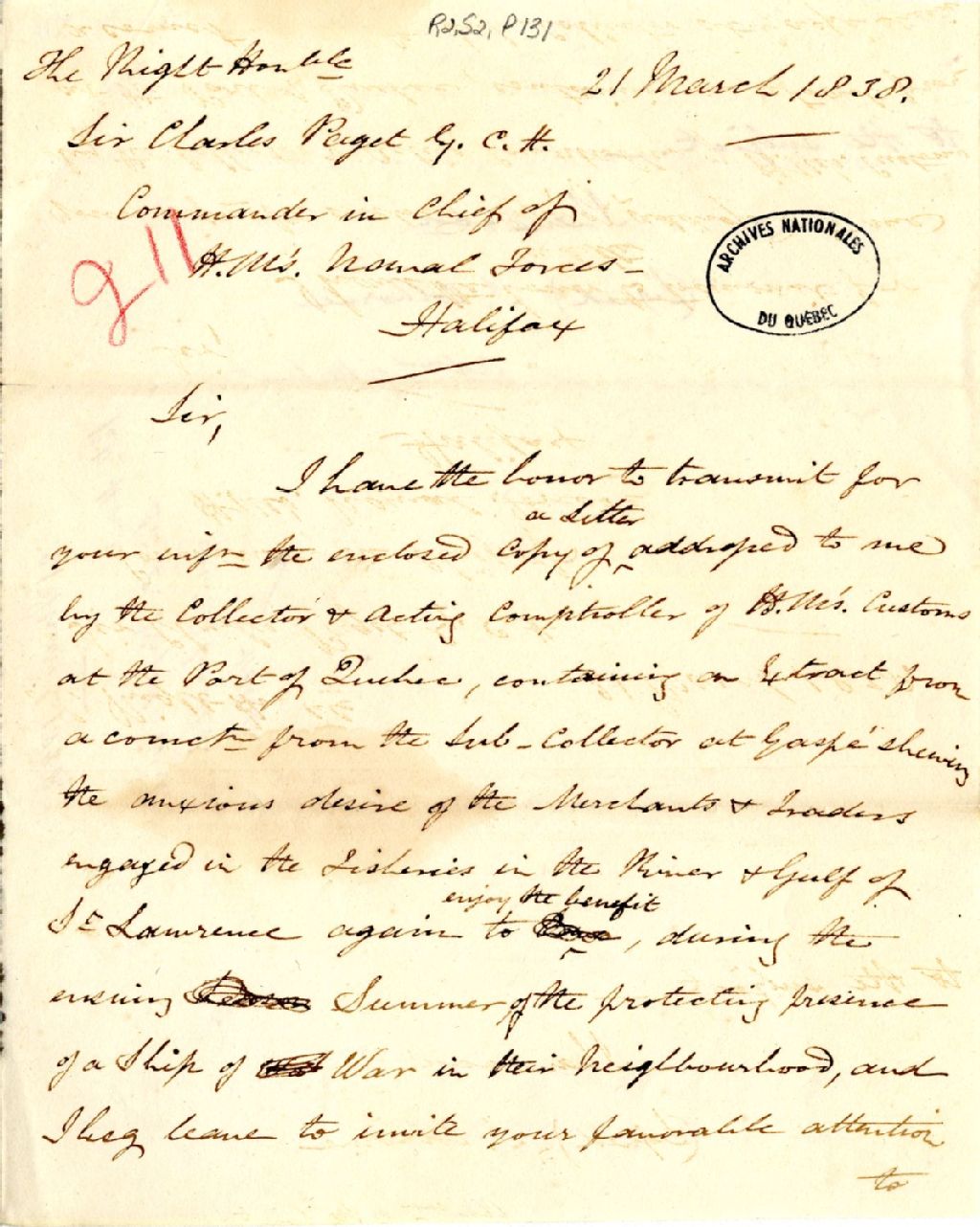 Lettre de John Colborne à Charles Paget, commandant des forces navales de l’Amérique du Nord. Les pêcheurs du golfe Saint-Laurent le prient de vouloir bien envoyer de nouveau un navire de guerre pour protéger leurs intérêts, 21 mars 1838, Archives nationales à Québec, Fonds Gouverneurs, régime anglais, (03Q,R2,S2,P131).