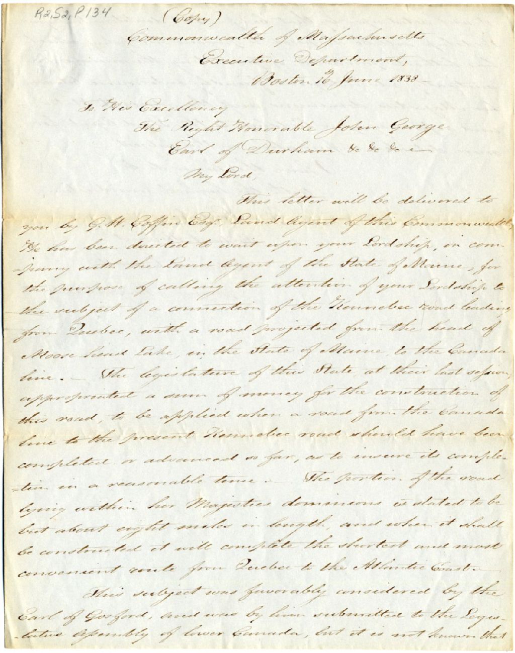 Lettre du gouverneur du Massachusetts, Edward Everett au gouverneur John George Durham au sujet de la communication projetée entre le chemin de Kennebec qui part de Québec et un chemin aux Etats-Unis qui débuterait au Moosehead Lake jusqu'à la frontière canado-américaine, 16 juin 1838, Archives nationales à Québec, Fonds Gouverneurs, régime anglais, (03Q,R2,S2,P134).