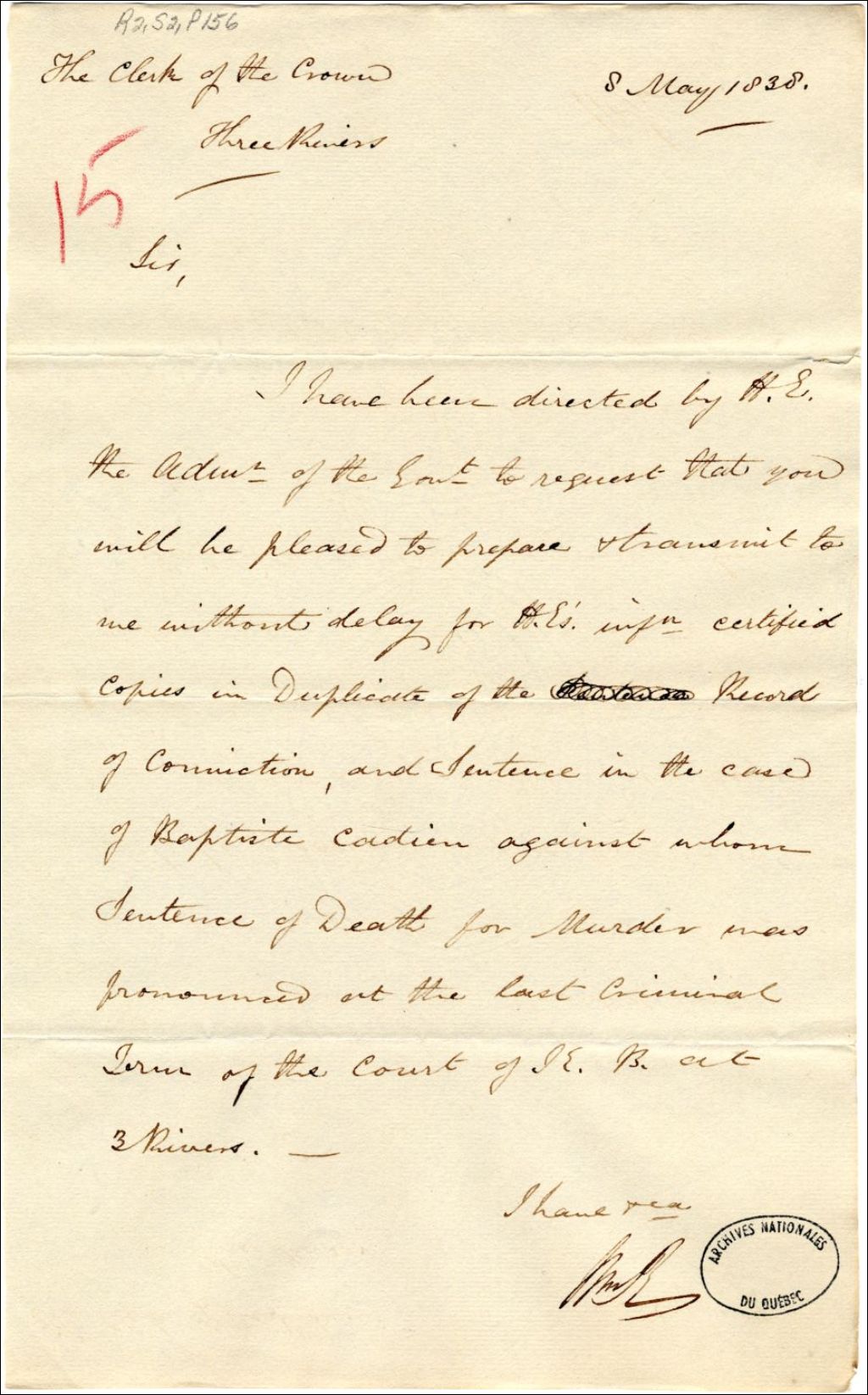 Lettre du secrétaire civil William Rowan pour l'administrateur du gouvernement, John Colborne, au greffier de la Couronne aux Trois-Rivières. Il est prié de lui envoyer toutes les pièces du procès de Baptiste Cadieux, condamné à mort pour meurtre, 8 mai 1838, Archives nationales à Québec, Fonds Gouverneurs, régime anglais, (03Q,R2,S2,P156).