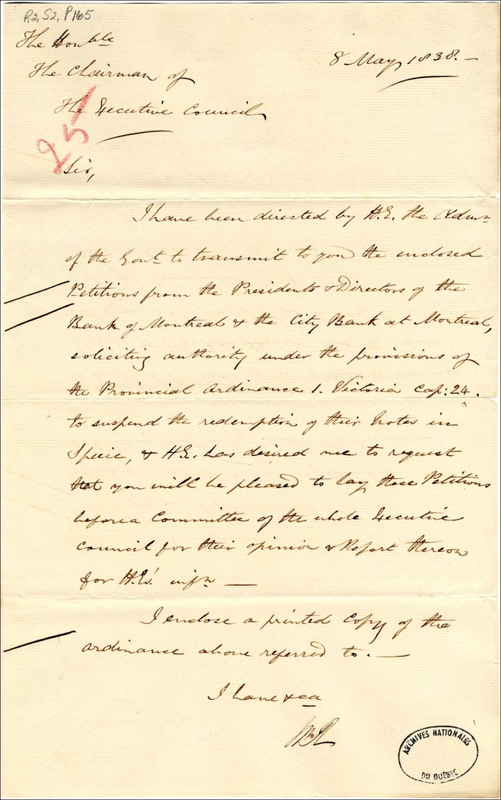 Lettre du secrétaire civil William Rowan pour l'administrateur du gouvernement, John Colborne, au président du Conseil exécutif, Québec. Requête des présidents et directeurs de la Banque de Montréal et de la City Bank à Montréal de suspendre le rachat de leurs billets en espèce en vertu de l'ordonnance 1, Victoria, Chap. 24. Il demande au président du conseil éxécutif de former un comité de tous les membres du conseil pour obtenir leur opinion à propos de cette requête, 8 mai 1838, Archives nationales à Québec, Fonds Gouverneurs, régime anglais, (03Q,R2,S2,P165).