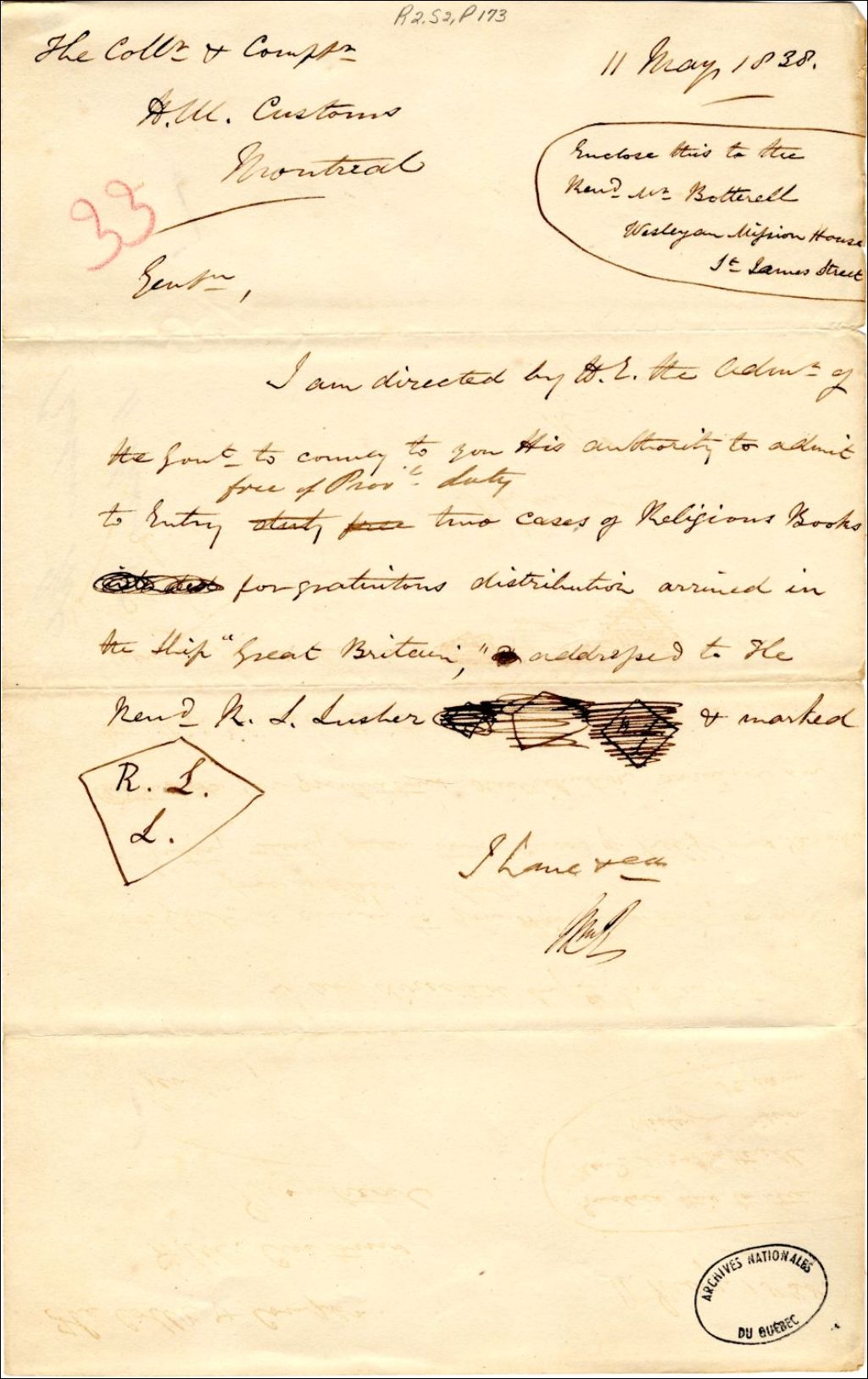 Lettre du secrétaire civil William Rowan pour l'administrateur du gouvernement, John Colborne, au contrôleur des douanes à Montréal. Deux caisses de livres religieux pour une distribution gratuite sont arrivées de Londres au nom du révérend R. L. Lusher. Elles sont exemptées de frais de douane, 11 mai 1838, Archives nationales à Québec, Fonds Gouverneurs, régime anglais, (03Q,R2,S2,P173).