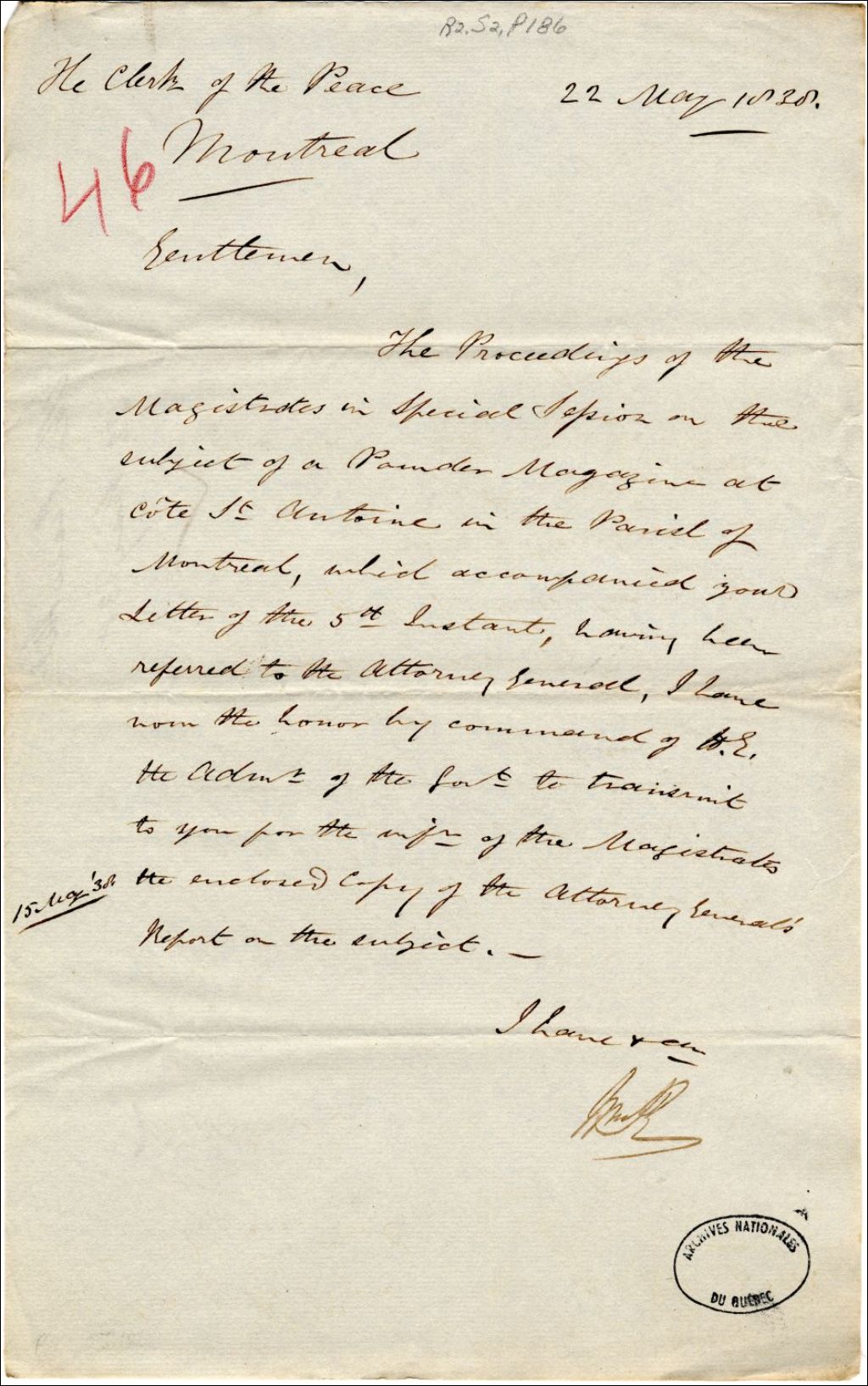 Lettre du secrétaire civil William Rowan pour l'administrateur du gouvernement, John Colborne, au greffier de la paix, à Montréal. Il lui envoie le rapport du procureur général, concernant un magasin de poudre à canon, à la côte Saint-Antoine, à Montréal, 22 mai 1838, Archives nationales à Québec, Fonds Gouverneurs, régime anglais, (03Q,R2,S2,P186).