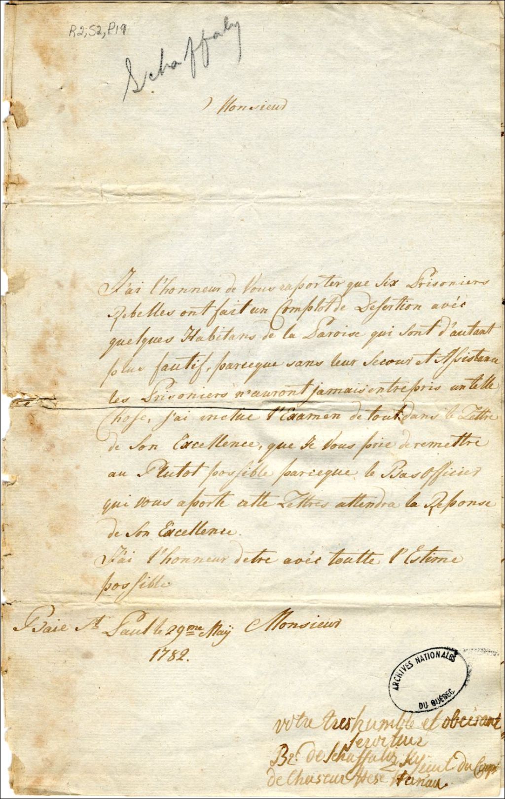 - Lettre du baron Schaffalisky, lieutenant du Corps de chasseurs de Hesse-Hanau, au major et adjudent Lernoult pour la capture de six prisonniers rebelles qui ont monté un complot de désertion avec l'aide de quelques habitants de Baie-Saint-Paul. Les six prisonniers : William Harper, George Stivenson, John Hilmer, Thomas Tute, James Cooley et James Durham. Complicité des Canadiens Joseph Barette et Bruneau Tremblay. Témoignages de Barrette (Barette) et du meunier Joseph Simard. Ignace Gagné a vendu aux prisonniers un compas de voyage
