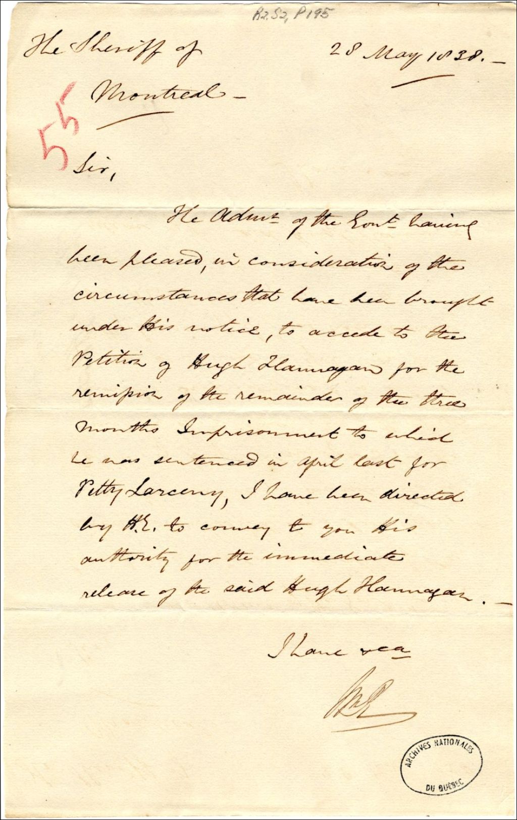 Lettre du secrétaire civil William Rowan pour l'administrateur du gouvernement, John Colborne, au shérif de Montréal. L’administrateur lui ordonne de remettre en liberté Hugh Hannagan, condamné à la prison pour vol, 28 mai 1838, Archives nationales à Québec, Fonds Gouverneurs, régime anglais, (03Q,R2,S2,P195).