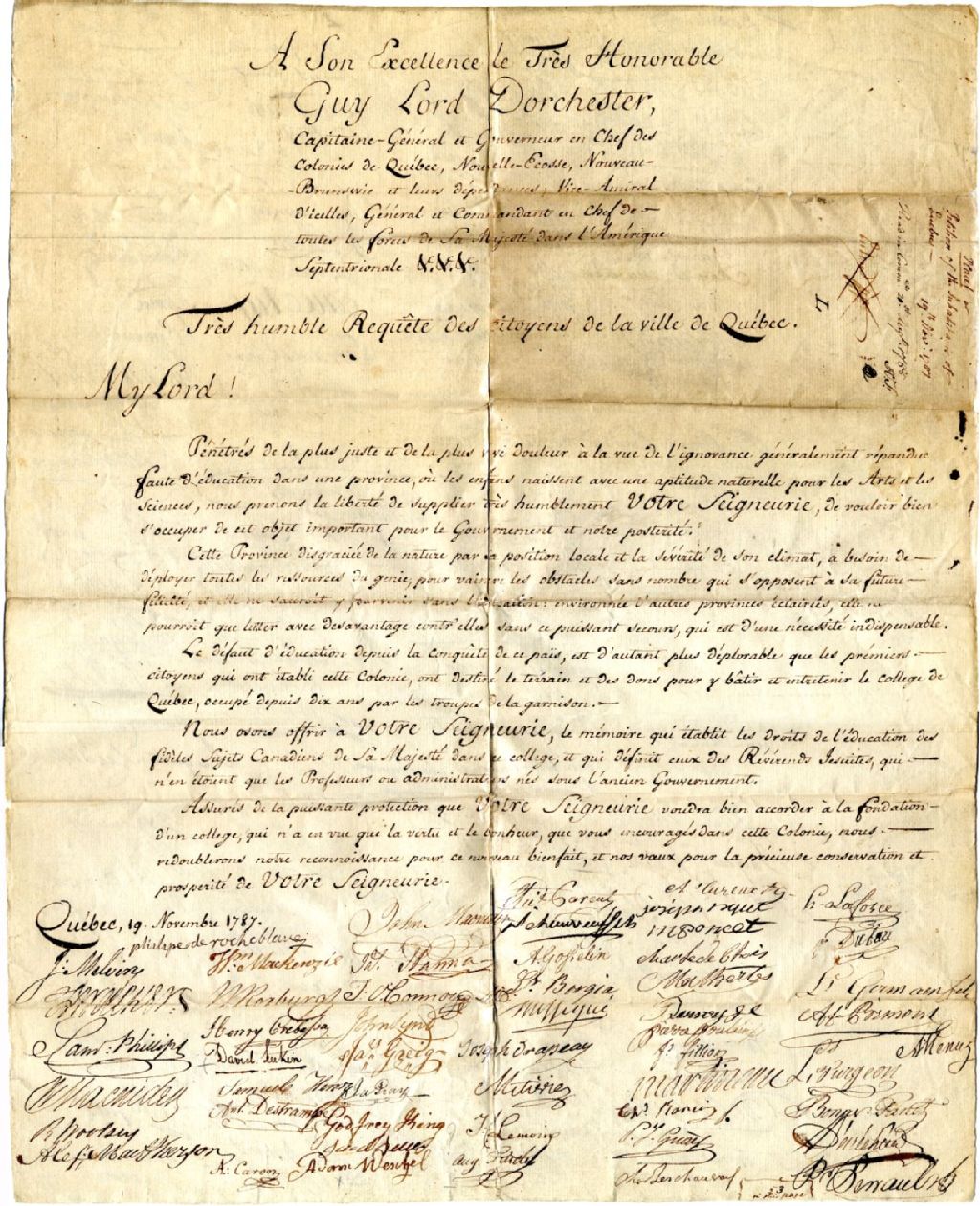 Requête des citoyens de la ville de Québec au gouverneur Guy Carleton, Lord Dorchester, demandant d'accorder la fondation d'un collège. Le Collège de Québec (Collège des Jésuites) est occupé depuis dix ans par les troupes de la garnison. «Nous osons offrir à Votre Seigneurie, le mémoire qui établit les droits de l'éducation des fidèles Sujets Canadiens de Sa Majesté dans ce college, et qui définit ceux des Révérends Jesuites, qui n'en étoient que les Professeurs ou administrateurs nés sous l'ancien Gouvernement».