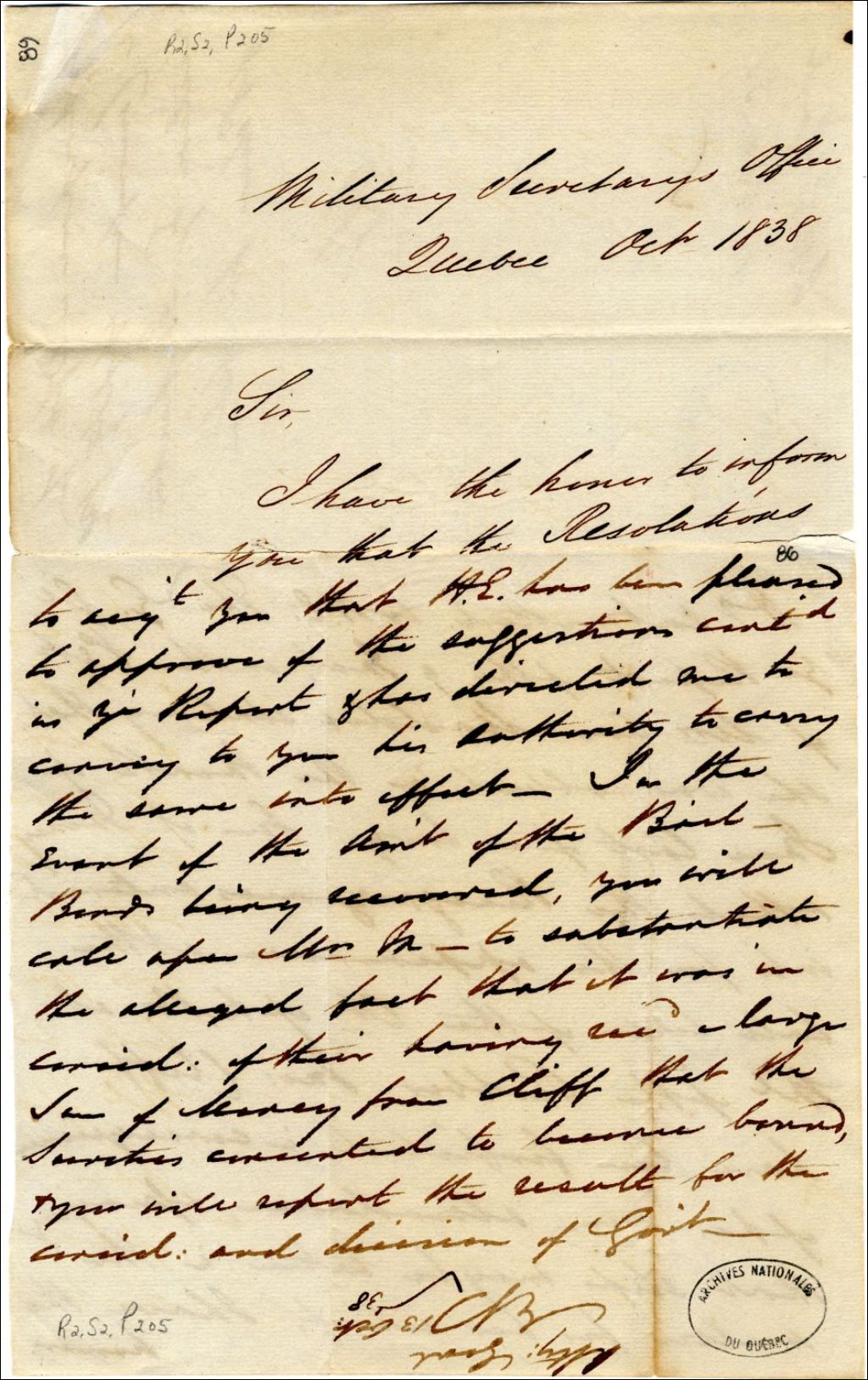 Lettre du secrétaire civil Charles Buller pour le gouverneur général, au procureur général. À propos de John Cliff qui ne s'est pas présenté à la cour du banc du roi suite au vol d'une forte somme d'argent à Ann Maddox, 13 octobre 1838, Archives nationales à Québec, Fonds Gouverneurs, régime anglais, (03Q,R2,S2,P205).