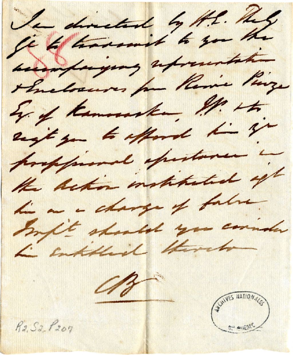 Lettre du secrétaire civil Charles Buller pour le gouverneur général, au procureur général à propos du notaire Rémi Piuze, de Kamouraska. Il s'agit de savoir si les charges portées contre lui sont maintenues, 15 octobre 1838, Archives nationales à Québec, Fonds Gouverneurs, régime anglais, (03Q,R2,S2,P207).