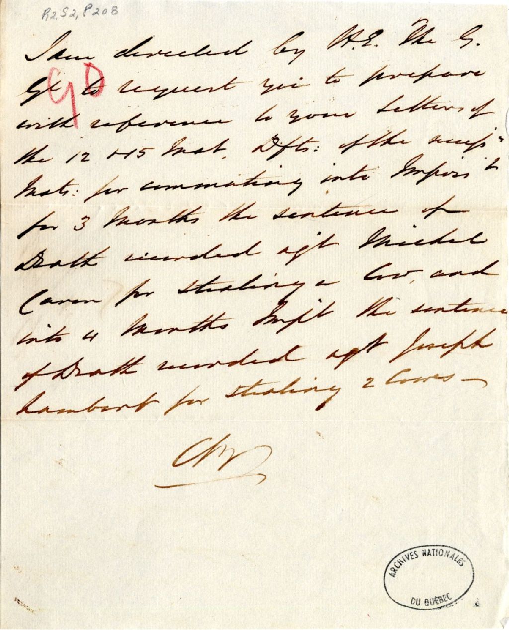 Lettre du secrétaire civil Charles Buller pour le gouverneur général, au procureur général. La sentence de mort prononcée contre Michel Caron est commuée en trois mois d’emprisonnement, et celle prononcée contre Joseph Lambert, en quatre mois, 16 octobre 1838, Archives nationales à Québec, Fonds Gouverneurs, régime anglais, (03Q,R2,S2,P208).