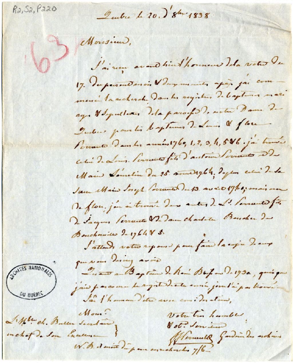 Lettre de J. -F. Perrault, gardien des Archives, au secrétaire civil Charles Buller, Québec. Il a trouvé les actes de baptême dans la paroisse Notre-Dame-de-Québec des personnes dont le secrétaire désire obtenir les dates de naissance, 20 octobre 1838, Archives nationales à Québec, Fonds Gouverneurs, régime anglais, (03Q,R2,S2,P220).