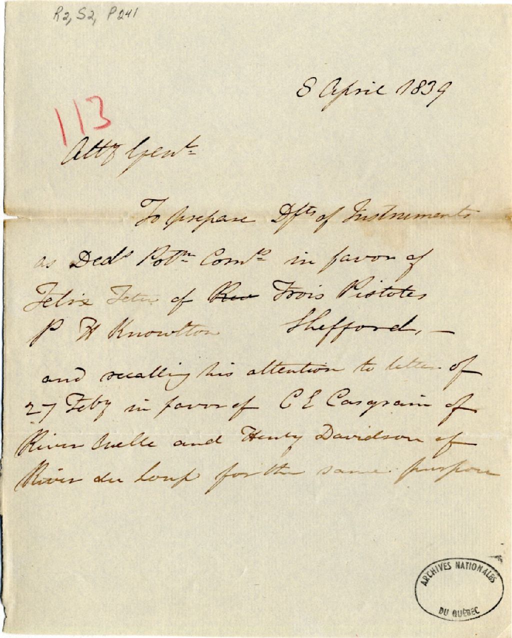 Lettre du secrétaire civil T. Leigh Goldie au procureur général. Il demande de préparer les documents par dedimus potestatem (nous avons donné le pouvoir) en faveur de Félix Têtu de Trois-Pistoles. Il demande de porter à l'attention de Paul Holland Knowlton la mise en candidature de Charles-Eugène Casgrain de Rivière-Ouelle et Henry Davidson de Rivière-du-Loup au même poste, 8 avril 1839, Archives nationales à Québec, Fonds Gouverneurs, régime anglais, (03Q,R2,S2,P241).