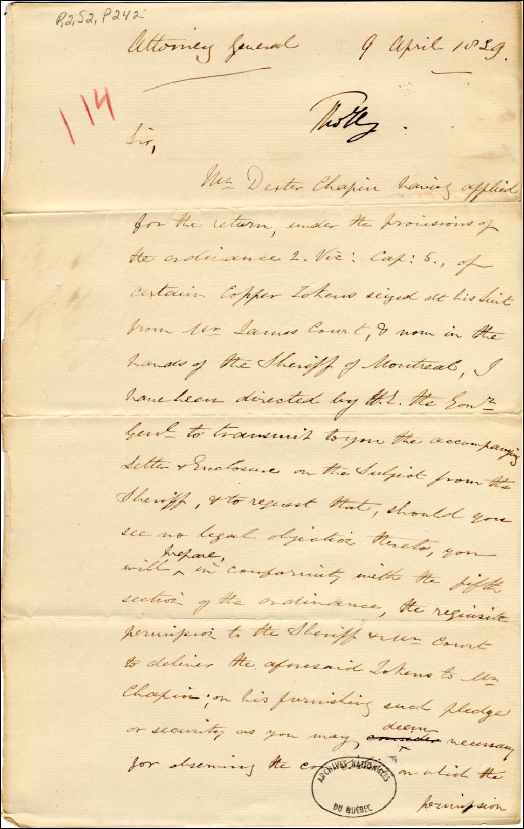 Lettre du secrétaire civil T. Leigh Goldie pour le gouverneur général, John Colborne, au procureur général. Il demande la permission requise pour que le shérif de Montréal et James Court puissent livrer à Dexter Chaplin les monnaies de cuivre défectueuses que James Court avaient saisies dans ces habits pour qu'il puisse les réexporter, 9 avril 1839, Archives nationales à Québec, Fonds Gouverneurs, régime anglais, (03Q,R2,S2,P242).