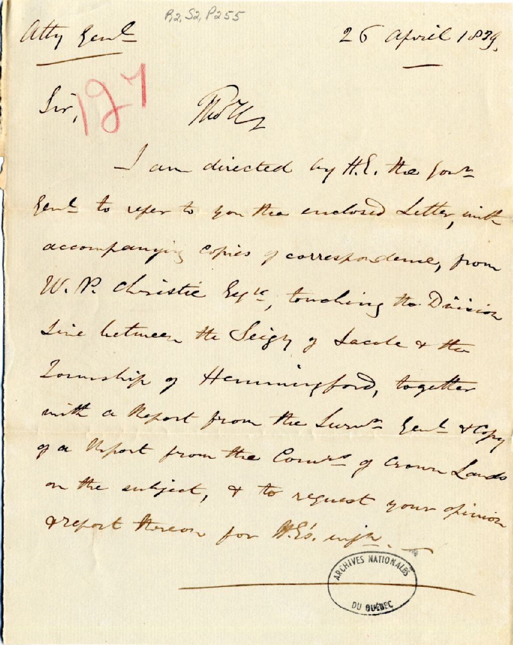 Lettre du secrétaire civil T. Leigh Goldie pour le gouverneur général, John Colborne, au procureur général. Il a reçu une lettre de W. P. Christie concernant l'absence de délimitation entre la seigneurie de Lacole (Lacolle) et le canton d'Hemmingford ainsi qu'une lettre du commissaire des terres de la couronne sur ce sujet, 26 avril 1839, Archives nationales à Québec, Fonds Gouverneurs, régime anglais, (03Q,R2,S2,P255).