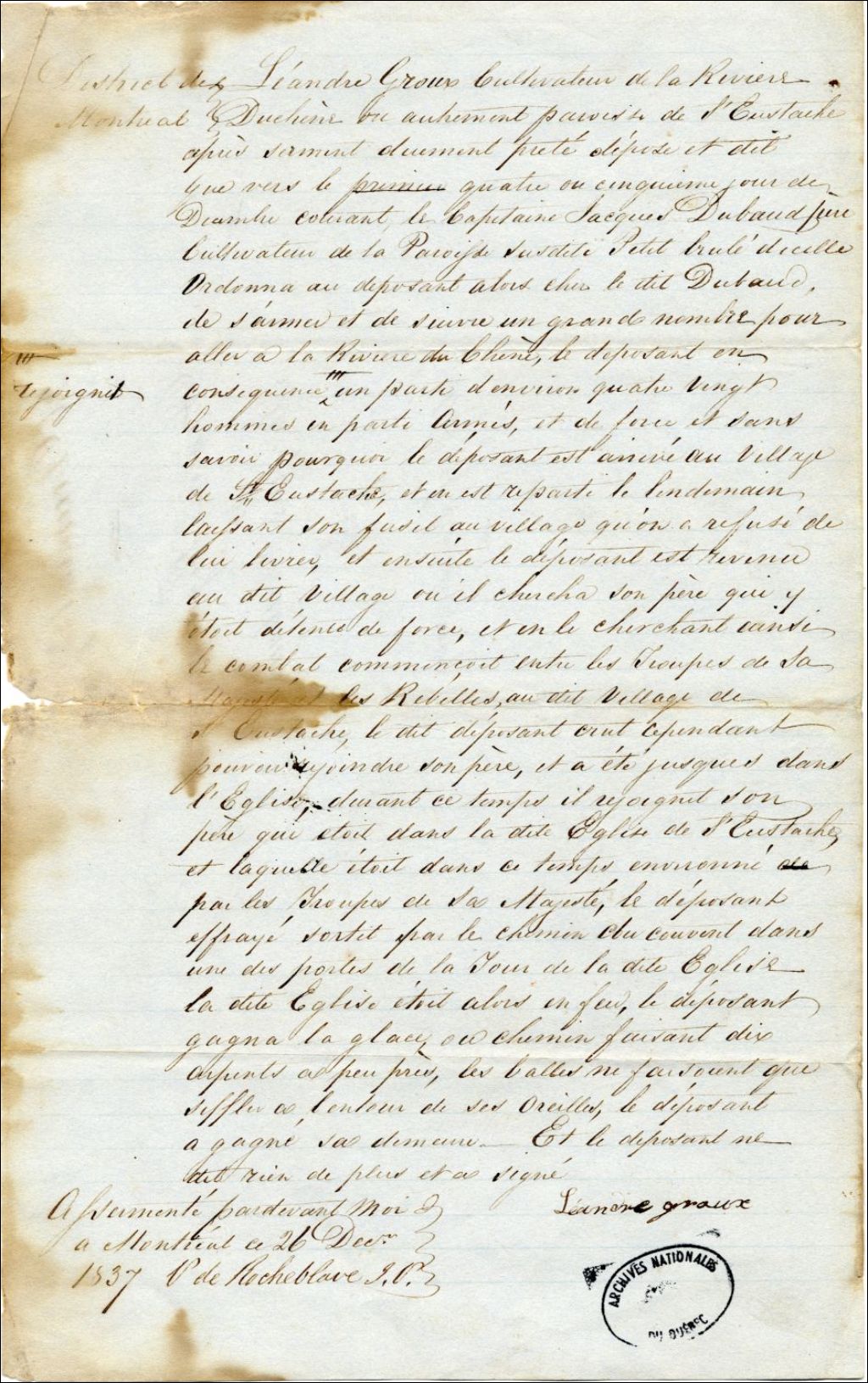 Affidavit de Léandre Groux (Groulx), cultivateur de la Rivière du Chêne. Il dit que Jacques Dubaud (Dubos), père, lui ordonna de s'armer et d'accompagner un groupe d'hommes. Il s'est rendu à Saint-Eustache pour le combat, qu'il est entré dans l'église qui était entourée par les troupes de Sa majesté. Il en est sortit alors qu'elle était en feu et a gagné sa demeure, pendant que les balles sifflaient à ses oreilles, 26 décembre 1837, Archives nationales à Québec, Fonds Gouverneurs, régime anglais, (03Q,R2,S2,P293_20).