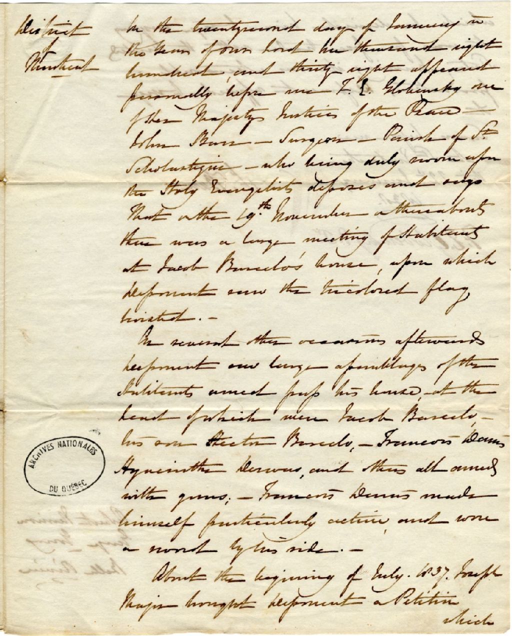 Déposition de John Barr, médecin à Sainte-Scholastique. Il déclare que le 19 novembre précédent, une grande assemblée s'est tenue à la maison de Jacob Barcelo (Barsalou) à l'occasion de laquelle il a vu le drapeau tricolore déployé. Il déclare d'autres faits concernant Hector Barcelou (Barsalou) (Barsalou), François Danis et autres, 22 janvier 1838, Archives nationales à Québec, Fonds Gouverneurs, régime anglais, (03Q,R2,S2,P293_25).