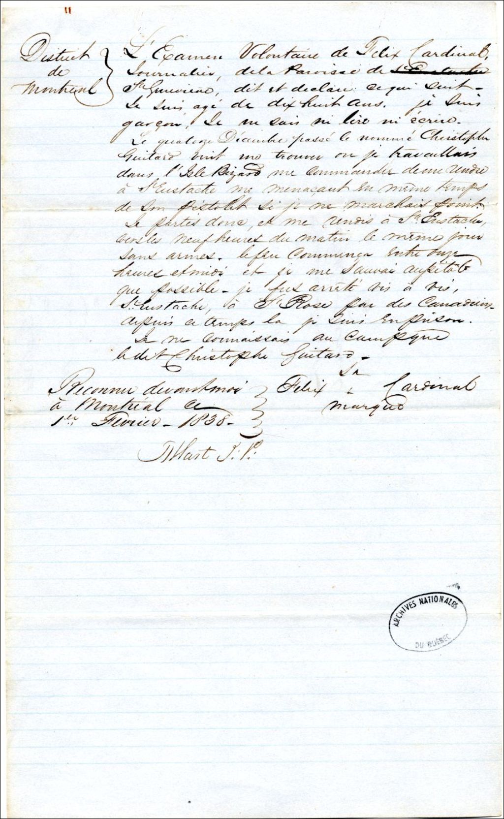 Examen volontaire de Félix Cardinal, journalier à Sainte-Geneviève. Il déclare que Christophe Guitard vint le trouver à l'Île Bizard, lui commandant de se rendre avec lui à Saint-Eustache où il arriva le jour du feu. Qu'il fut arrêté et que depuis ce temps, il est en prison
