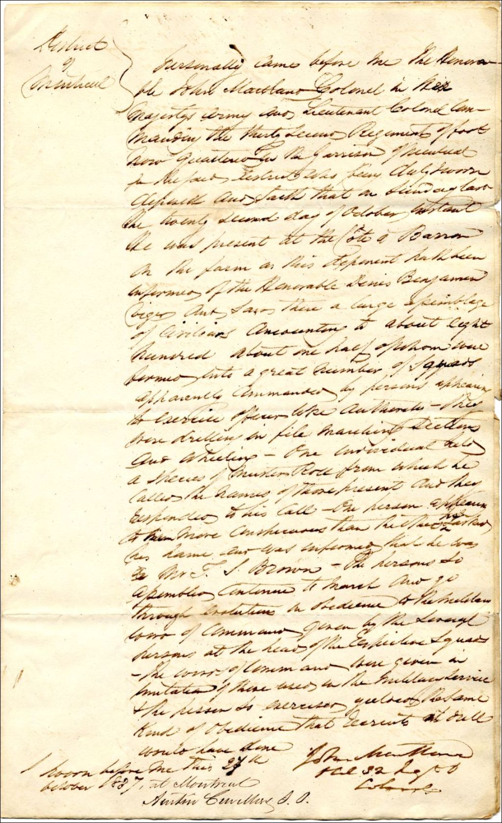 Affidavit du lieutenant-colonel John Mitland du 32ème régiment déclarant qu'Étant présent le 22 octobre 1837 sur la Côte à Baron (Barron), ferme de Denis Benjamin Viger. Il vit un groupe d'environ 300 citoyens (Fils de la Liberté) faisant des exercices de milice