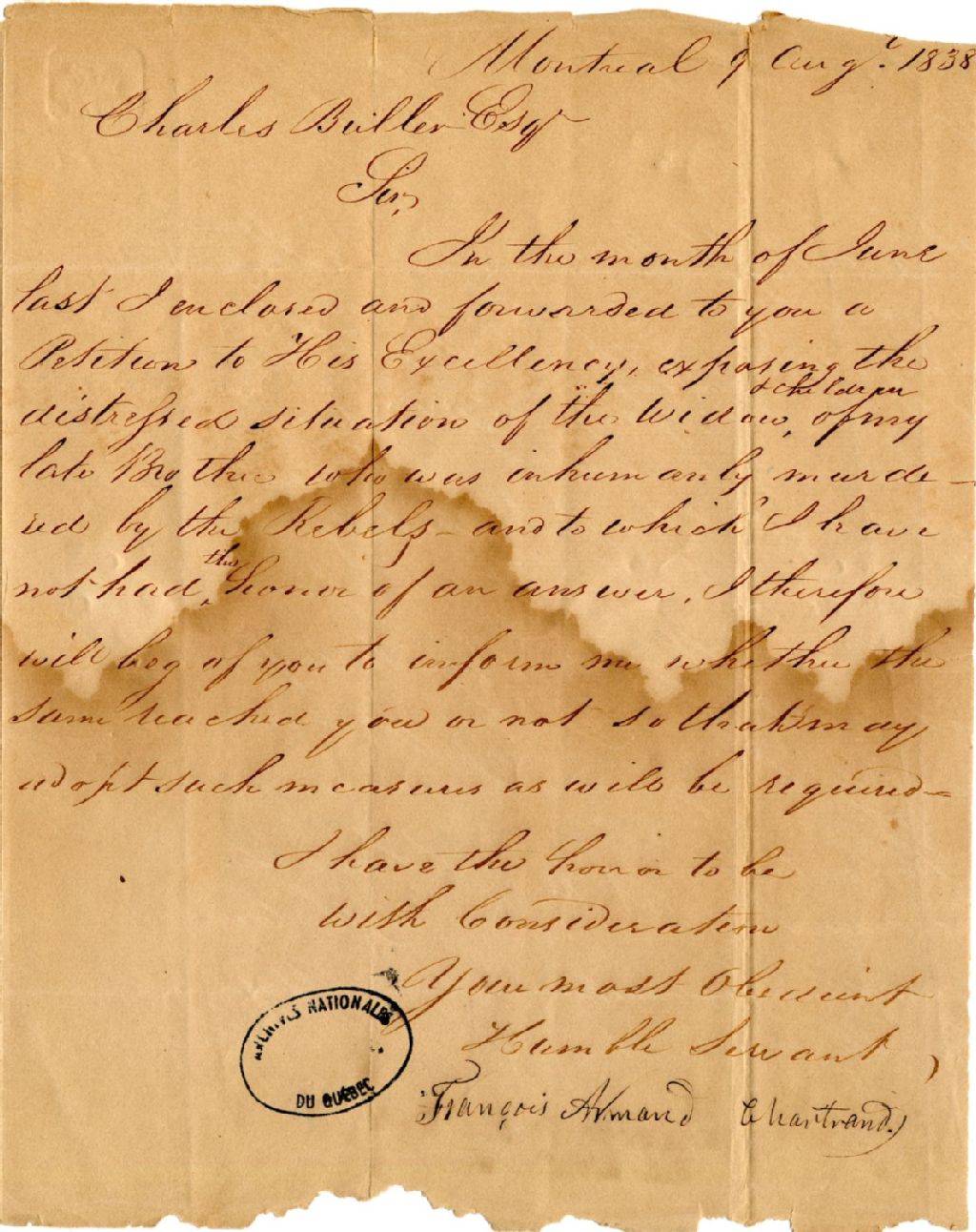 Lettre de François Armand Chartrand à Charles Buller, secrétaire civil. Monsieur Chartrand dit qu'il a envoyé une pétition à son Excellence, en juin 1838, lui exposant la détresse de la veuve et des enfants de son frère, assassiné par les rebelles. Étant donné qu'il n'a reçu aucune réponse, il s'informe si sa première lettre est parvenue à destination, 9 août 1838, Archives nationales à Québec, Fonds Gouverneurs, régime anglais, (03Q,R2,S2,P293_43).