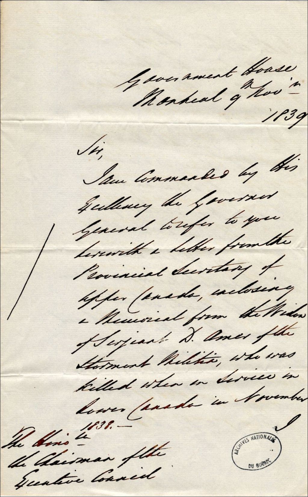 Lettre de Thomas Murdoch, secrétaire civil au président du conseil exécutif. Il lui réfère la requête de la veuve du sergent D. Amer du premier régiment de la milice de Stormont, Haut-Canada, venu se battre contre les rebelles. Elle lui demande de bien vouloir lui accorder une pension, 9 novembre 1839, Archives nationales à Québec, Fonds Gouverneurs, régime anglais, (03Q,R2,S2,P293_45).