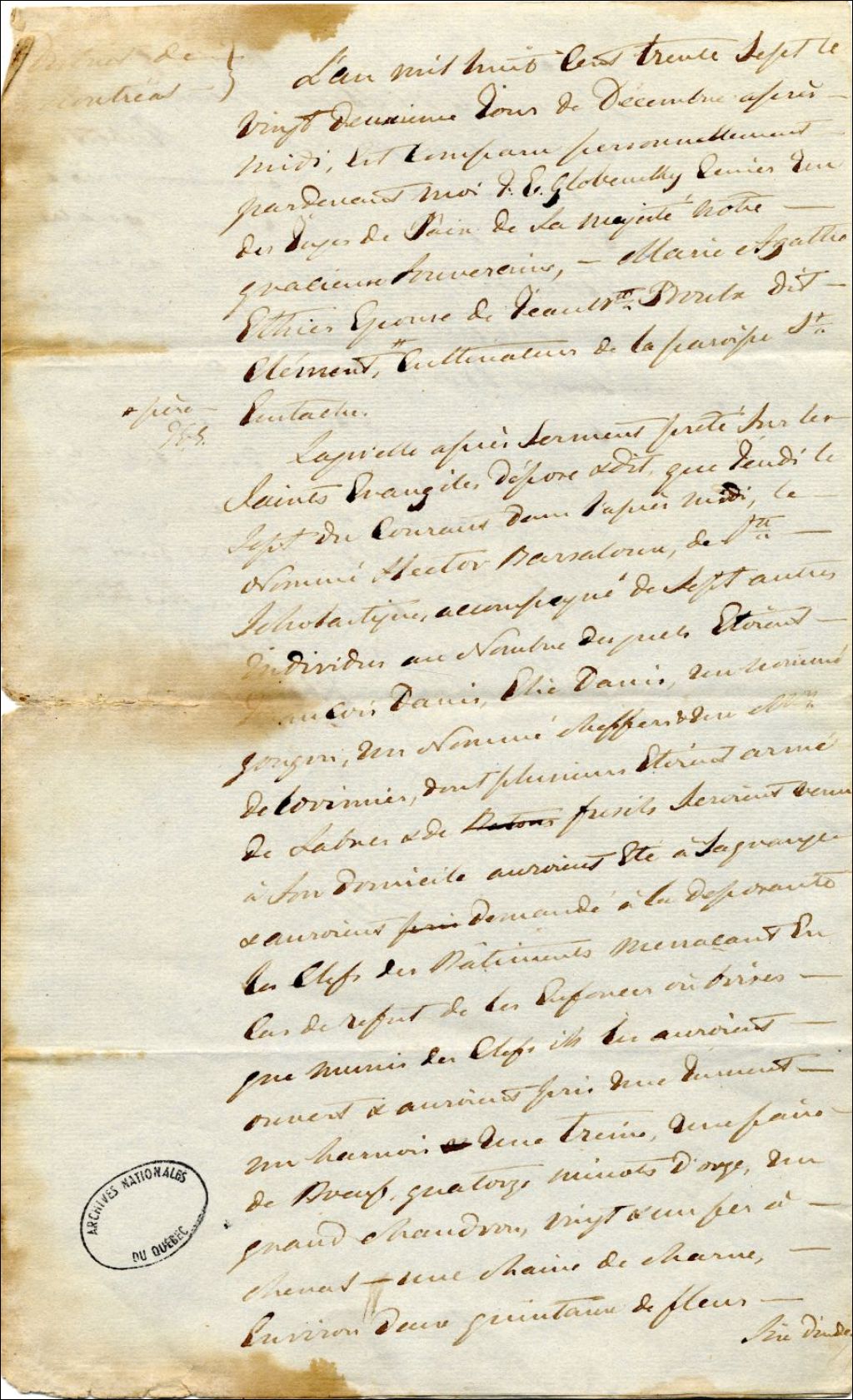 Déposition de marie Agathe Éthier de Saint-Eustache. Elle déclare qu'Hector Barsalou, accompagné de 7 autres individus dont Élie Denis, Sheffers, Delorimier, armés de fusils, se seraient, avec menaces, emparés de diverses choses de valeur, 30 septembre 1837, Archives nationales à Québec, Fonds Gouverneurs, régime anglais, (03Q,R2,S2,P293_9).
