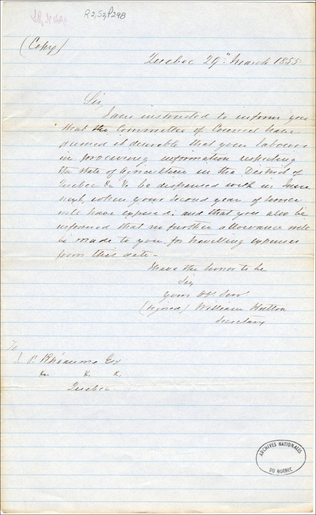 Lettre de William Hutton, secrétaire du Bureau d'agriculture à Jacques P. Rhéaume. Il lui mentionne qu'il n'y plus d'argent pour le maintien de son poste de collecteur d'informations sur l'état de l'agriculture dans le district de Québec. Il est mentionné qu'il ne doit pas présenter de compte de dépenses, car il ne sera pas remboursé