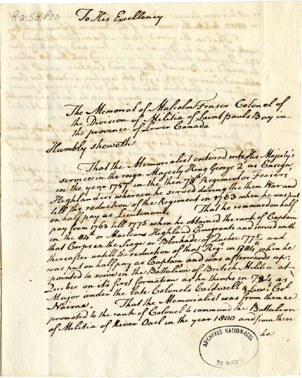 Lettre de Malcolm Fraser, colonel de division de milice de Baie Saint-Paul, 66 ans en 1799, offrant ses services au gouverneur George Prévost. Demande d'être promu brigadier provincial. Donne ses états de service, 2 avril 1813, Archives nationales à Québec, Fonds Gouverneurs, régime anglais, (03Q,R2,S2,P30).