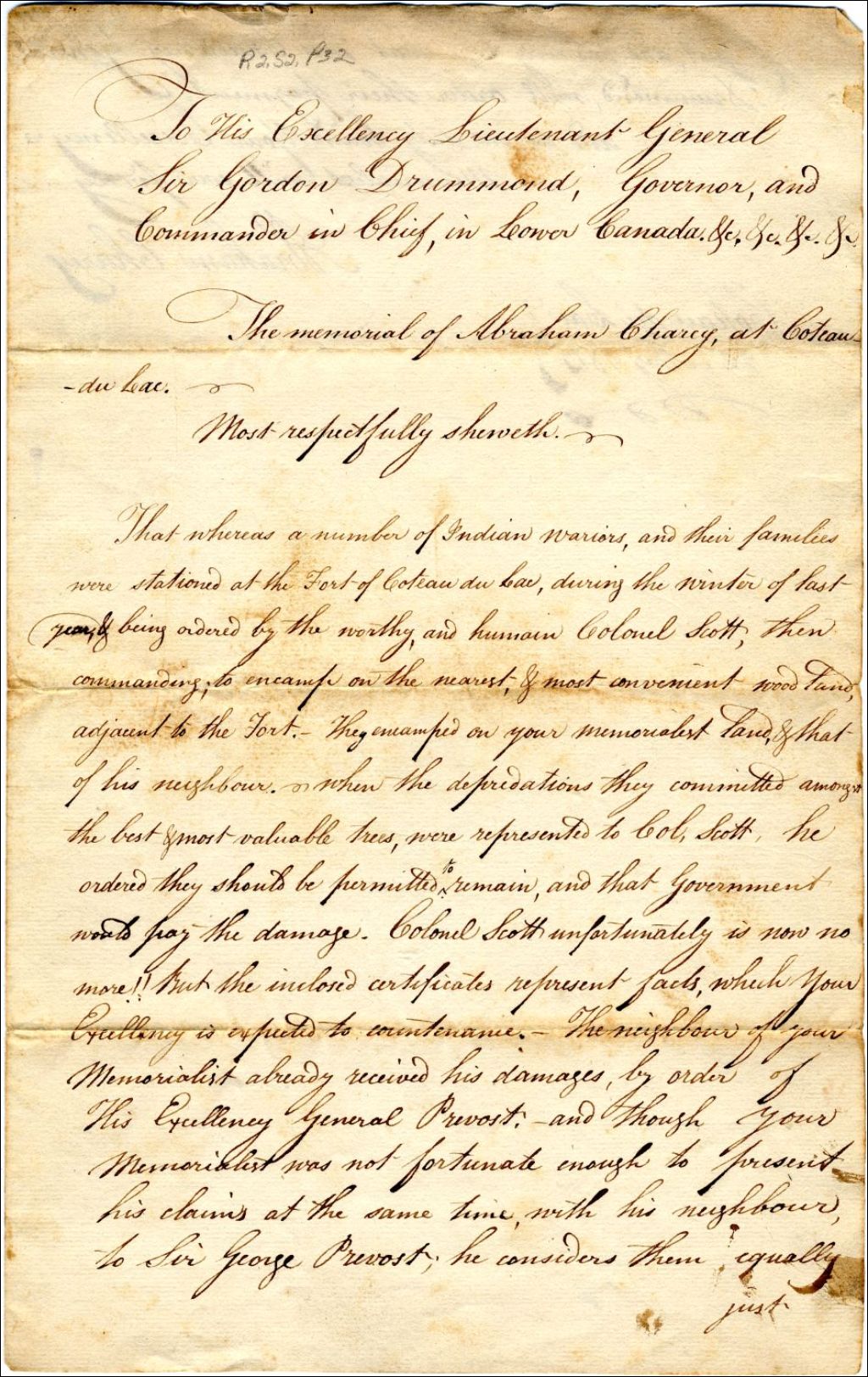 Lettre de Abraham Charey, de Coteau-du-Lac, à Gordon Drummond, gouverneur, au sujet de guerriers indiens et leur famille qui ont séjourné durant l'hiver dernier au fort de Coteau-du-Lac. Ils ont été placé sur sa terre près du fort et ont causé des dommages. Ses voisins ont déjà reçu leu compensation par le gouverneur Georges Prévost, mais pas lui. Il n'a pas pu présenter ces preuves au même moment