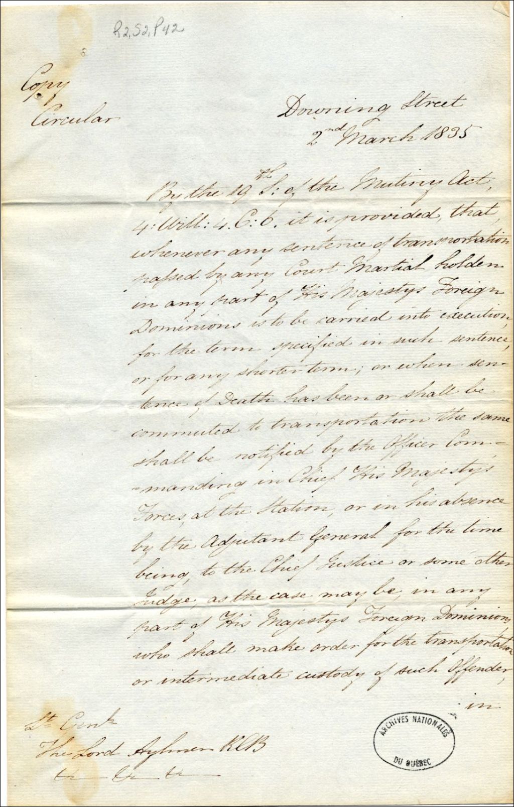 Lettre de Lord Aberdeen, secrétaire d'état à la guerre et aux colonies, au gouverneur Lord Aylmer mentionnant les dispositions du gouvernement quant aux règles à suivre concernant la déportation des prisonniers militaires britanniques vers les colonies d'Inde de l'Ouest (Bermudes), New South Wales (Australie) et d'Amérique du Nord, 2 mars 1835, Archives nationales à Québec, Fonds Gouverneurs, régime anglais, (03Q,R2,S2,P42).
